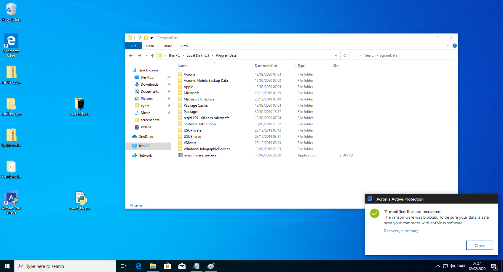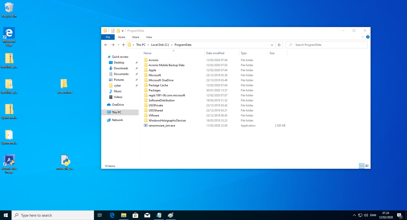 2. Copy a program that simulates ransomware to "C:\ProgramData\ransomware_sim.exe". This can contain arbitary payload as long as it simulates ransomware while in its original location and execute the arbitrary payload while in the quarantine location. Example code can be found below. WARNING: The example code does encrypt files, so do not use on any important files!!!