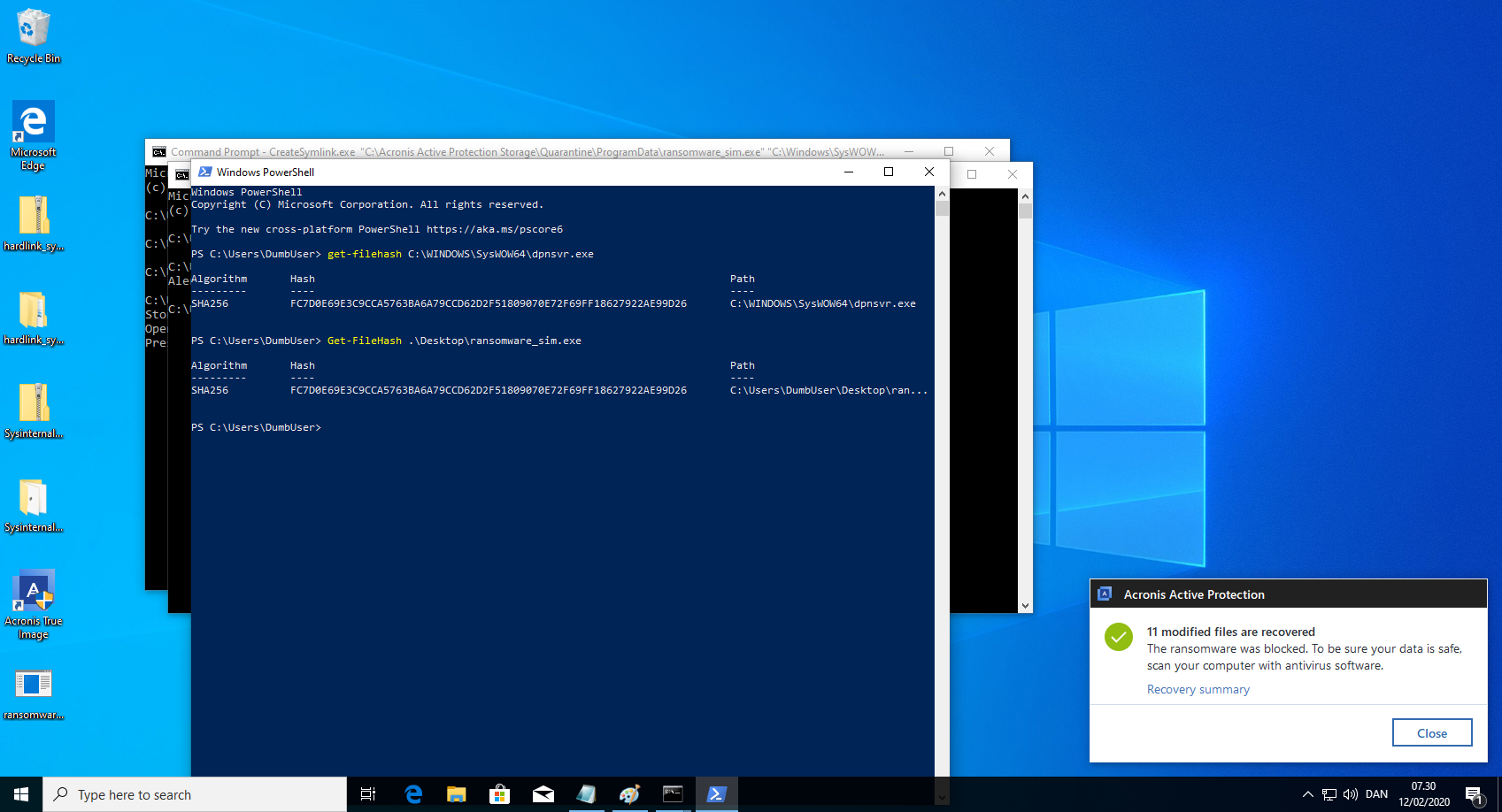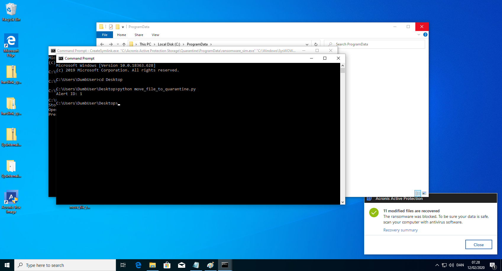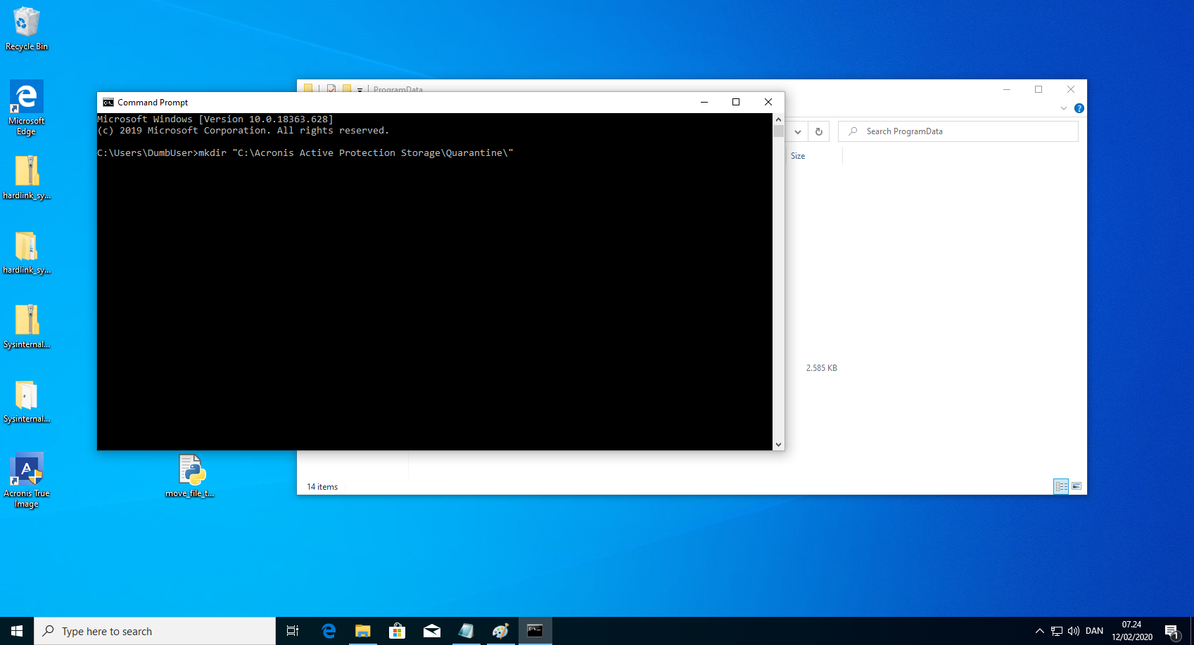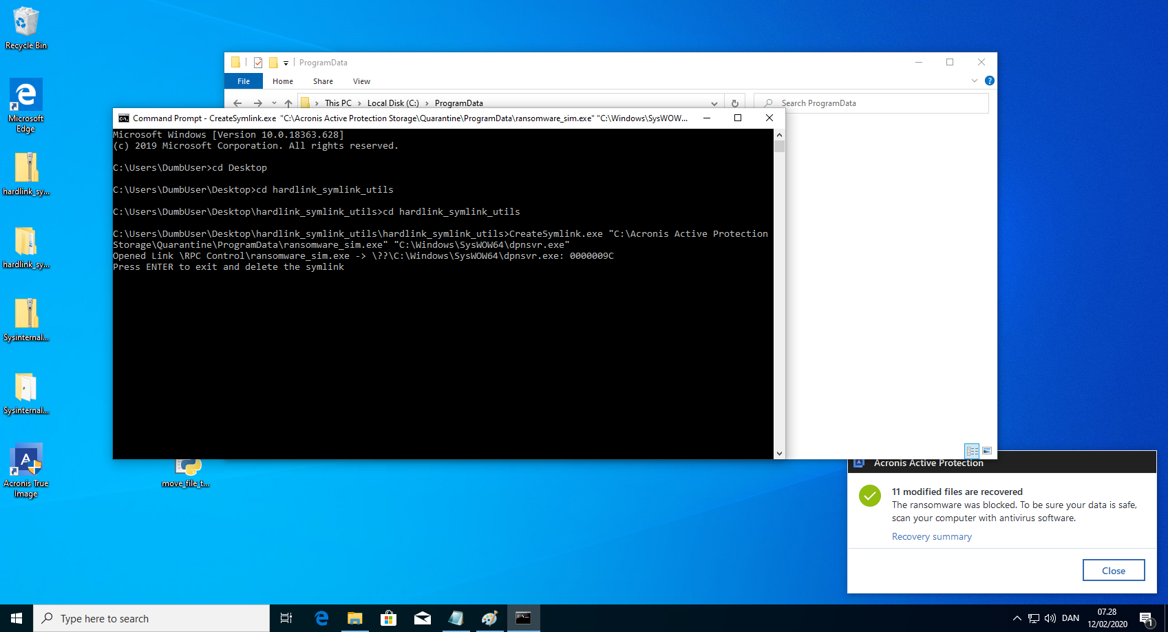 6. Run CreateSymlink.exe "C:\Acronis Active Protection Storage\Quarantine\ProgramData\ransomware_sim.exe" "C:\Windows\SysWOW64\dpnsvr.exe". Keep the command prompt open.