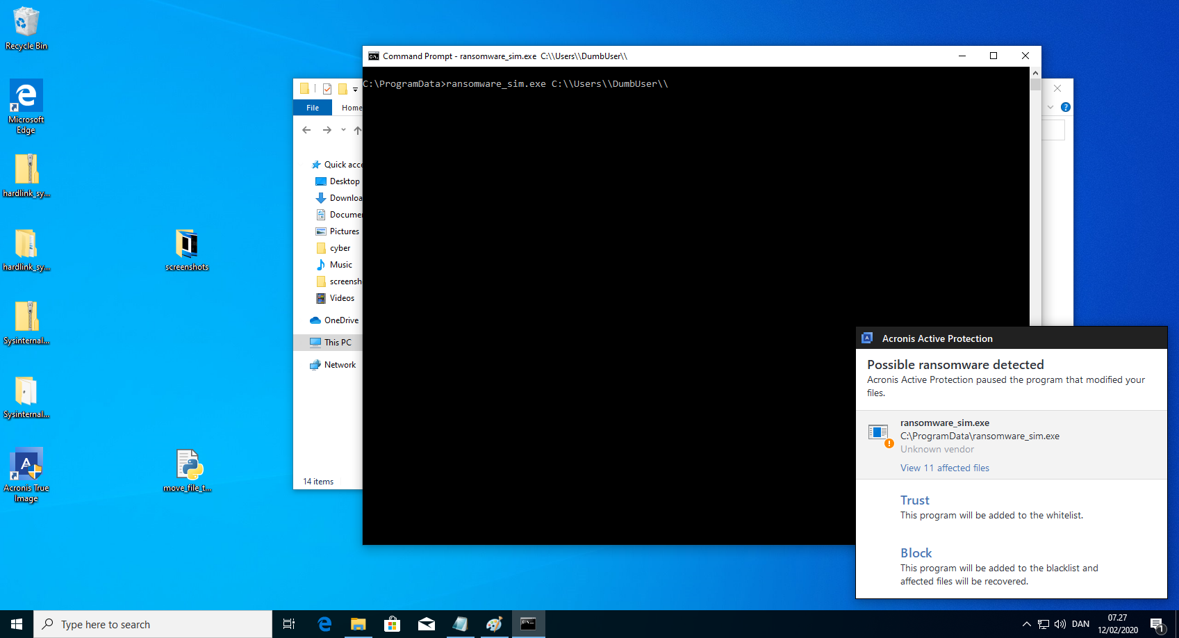 5. Wait for the ransomware to be detected by Acronis Active Protection. Press block on the Acronis dialog. Do NOT press close on the dialog!